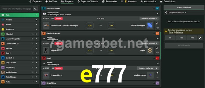 O e777 oferece uma grande seleção de opções de apostas em e-sports com probabilidades competitivas